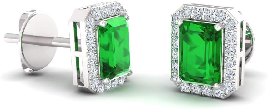 This pair of gemstone and diamond stud earrings are made in 14k white gold. Each earring features a beautiful emerald cut gemstone. The gemstones have a total weight of 0.74 carats. The gemstone are surrounded by a elegant halo of round diamonds with a total weight of 0.14 carats. These earrings are beautiful and elegant! A great gift for any time of year!